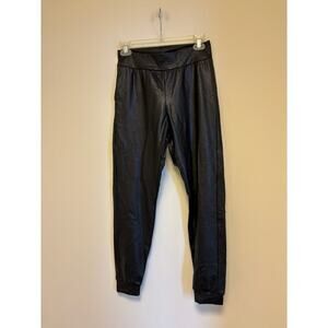 These faux leather jogger pants are the ultimate combination of cozy and chic. Made with commando's signature four-way stretch faux leather, and cut with a relaxed fit, these joggers can easily be styled up or down.