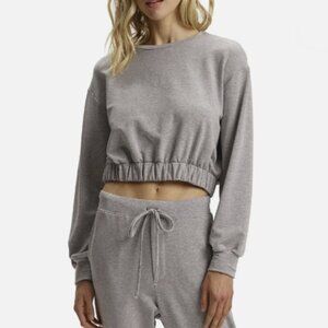 Cozy meets chic in this Commando Modern Lounge Sweatshirt in a versatile heather gray. Designed with a cropped silhouette and gathered elastic hem for a flattering fit, this comfy pullover is perfect for lounging, layering, or casual streetwear. Features long sleeves, a crew neckline, and a relaxed, easygoing vibe. Women's size XS – fits true to size. Pairs perfectly with high-waisted leggings, joggers, or denim for a laid-back yet stylish look.