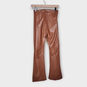 Brown faux leather pants with a high rise, pull-on waist, and flared leg. Smooth stretch construction for a sleek fit.