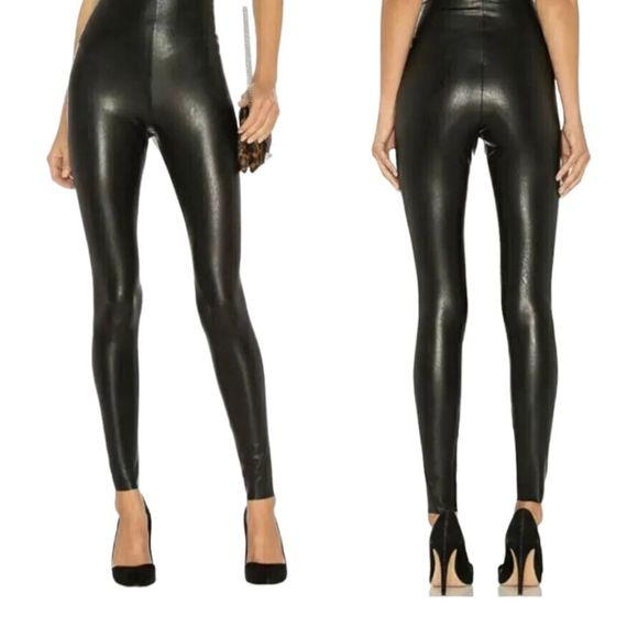 Our faux leather fabric has phenomenal four-way stretch, raw-cut edges and smoothing properties. These faux leather leggings are made with commando's signature internal waistband, flattering high-rise, and a slightly shorter length, raw-cut hem. Perfect for for showing off your favorite shoes whether they are heels or sneakers!