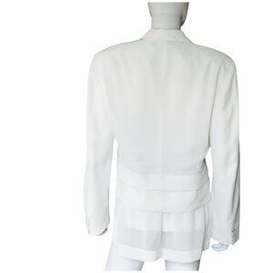 CDG feminine, Avant-Garde special occasion jacket. Jacket is pure white, no yellowing; slight show appears discoloration; it is not. "Boyfriend" fit so fits range of shoulder/bust measurements stylish, comfortable. International size Medium USA 6/8/10. Length 28" Shoulders 17ish" Sleeves 17" Bust Bra 34/36/38 B/C/D optimal. Synthetic. Layers of silk drape. I collected Comme Des Garcon. This piece Worn one time, cleaned, stored.
