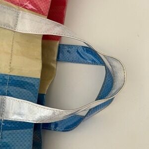 Multicolor woven tote with transparent vinyl shell. Twin carry handles at top. Logo printed in black at face. Patch pocket and logo patch in blue at interior. Textile lining in beige. Tonal and contrast stitching in white.