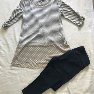 Comme Toi 3/4 Sleeve T-Shirt. Cute combination of stripes and polka dots. Neutral beige, cream and gray coloring. Button pull details on sleeves. The back is as cute as the front with an adorable pleat and button combination. Excellent condition (worn once). Size small.