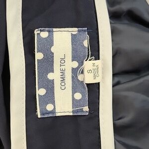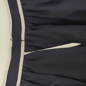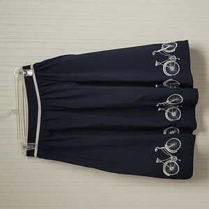 Comme Toi small navy and cream polyester skirt with embroidered bicycles around the bottom. hidden side zipper, slash side pockets. fully lined with 100% polyester. knee length. 26" waist (SK-020)
