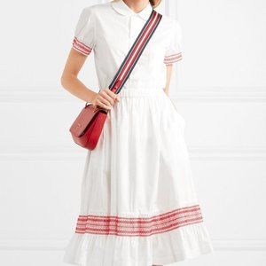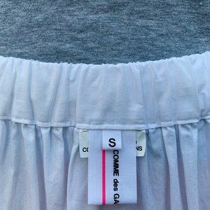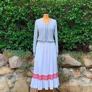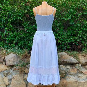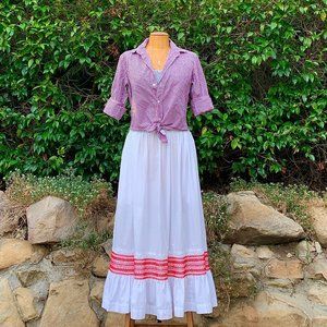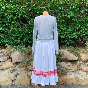 A cheery, wholesome, comfortable, with a nostalgic youthful feel skirt, by the playful and innovative Comme des Garcons GIRL division of Comme des Garcons. Made in Japan with side pockets, forgiving elastic waist band, shirred vibrant red thread, and perfectly ruffled hem. Measures 29" length, 13.5" unstretched elastic waist, size small. Worn once, washed once. Pristine condition.