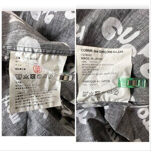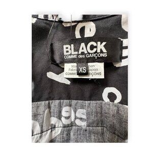 This is a collectible Black Comme des Garçons statement shirt designed with Rei Kawakubo’s characteristic graphic text motifs.
