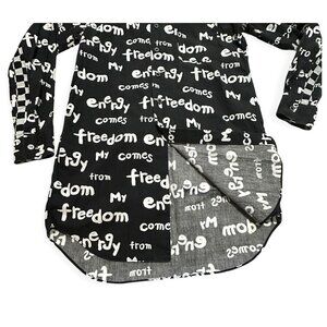 Made in Japan in 100% cotton. Features an all-over text print “My Energy Comes From Freedom” with bold graphic typography, and black/white checkerboard shoulder detail. Button-up front, chest pocket, long sleeves with button cuffs.
