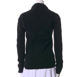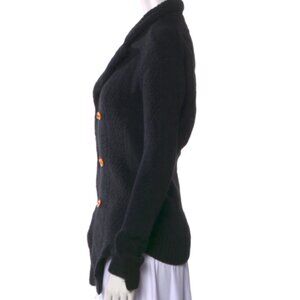 Black double-breasted cardigan sweater; front hangs longer in the front than the back. Size Small; 76% Wool, 12% Nylon, 12% Angora; Combo 100% Fleece Wool