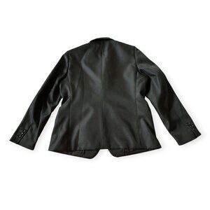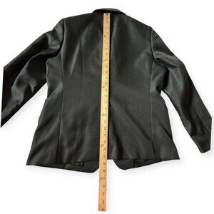 - Tailored, structured silhouette with three-button front closure