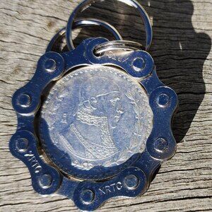 Unique Handmade Mexican Biker Chain Keychain featuring a Genuine Circulated 1959 10% Silver Peso Coin.