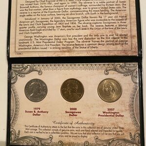 This exquisite commemorative coin set features three distinct coins, each with its own historical significance. The set includes a 1979 Susan B. Anthony Dollar, a 2000 Sacagawea Dollar, and a 2007 Washington Presidential Dollar. Each coin is beautifully crafted, making it a perfect addition to any collection.