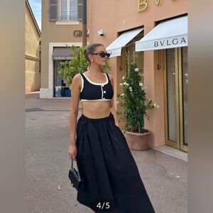 Chic black bikini with cream trim for a timeless look. High-waist bottom and supportive scoop-top deliver comfortable coverage. Decorative front buttons add a vintage-inspired detail. Designed for flattering fit and everyday beachwear in black and cream.