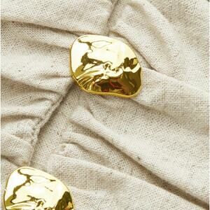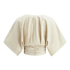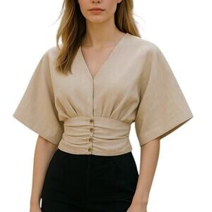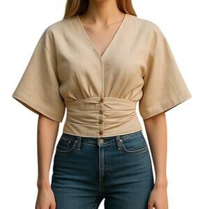 Stylish beige blouse with gold button accents. Features wide sleeves and a ruched waist. Ideal for a modern look.