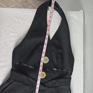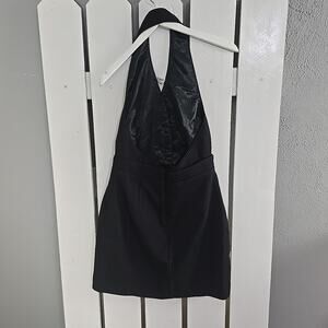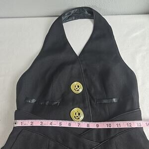 Chic black mini dress. Gold accent buttons. Stylish halter neckline. Ideal for nights out.