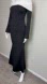 Sophisticated black evening gown with an elegant off-the-shoulder design. This formal dress features long sleeves and a fitted silhouette that gracefully flows into a mermaid-style hem. A contrasting white fold-over detail accentuates the neckline, adding a touch of classic refinement to the overall aesthetic. The dress exudes timeless charm and is perfect for black-tie events, galas, or any special occasion where making a stylish statement is key.