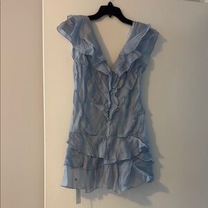 This charming sundress by Commense is perfect for a wedding guest or a night out. It features a light blue hue with flutter sleeves and a flattering V-neckline. The tiered ruffles and tie front add a playful touch to its mini length silhouette.