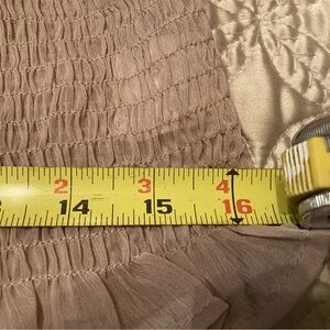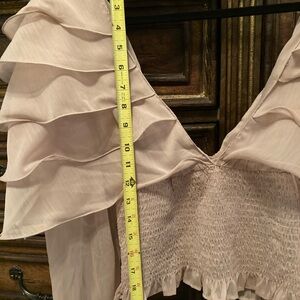 Chic blush blouse with ruffle details. Ideal for stylish outings. Deep V neck front and back with a tie for closure.