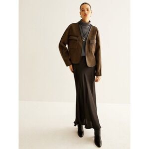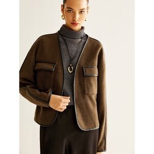 Fit Type: Regular Fit Elevate your everyday look with this sophisticated wool-blend jacket. The tailored boxy silhouette lends a modern, chic aesthetic, while the rich brown hue exudes understated elegance. Note the meticulously crafted leather trim outlining the open neckline, adding a touch of luxury and refinement. Two front patch pockets offer both visual appeal and practical functionality. The jacket drapes beautifully and is easy to dress up or down. Pair it with tailored trousers for a polished office ensemble, or throw it over a silk camisole and jeans for a night out.