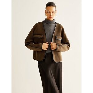 Commense Boxy Wool Blend Jacket Brown Leather Trimmed Pockets Modern Chic Style