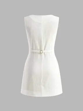 Sleeveless linen mini with a straight, flattering cut. Front wooden buttons add subtle detail. Lightweight fabric for warm days. Easy to style with sandals or a woven tote.