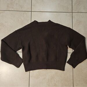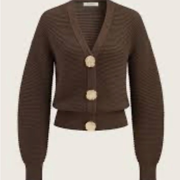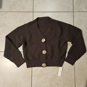 Elegant chocolate cardigan with bold buttons. Perfect for layering.