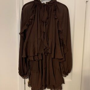 Sheer long sleeves with voluminous ruffles. Tiered skirt with a flowy silhouette. High ruffled neckline with chain detail. Elegant chocolate brown color for a refined look.