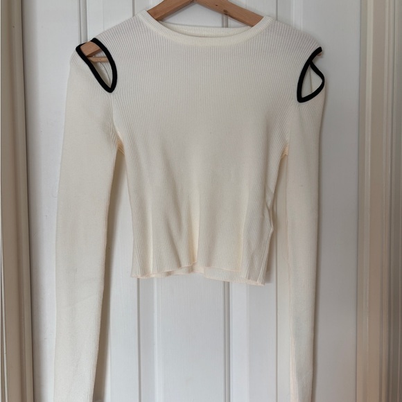 Elegant ivory ribbed knit top. Features a soft texture and classic design. Cropped length with black piping around cold shoulder cutouts