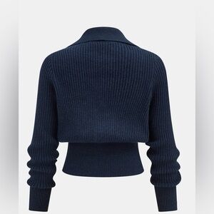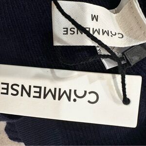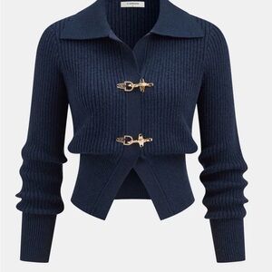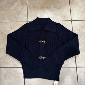 Elegant navy cardigan by Commense. Features gold buckle details. Ideal for stylish layering.