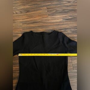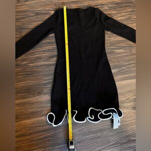 Sophisticated black dress with long sleeves. Features elegant ruffle hem. Ideal for any occasion.