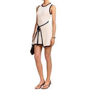 New with tags! This chic contrast-trim knit mini dress by Commense is the perfect balance of sophistication and minimalism. Designed in a soft cream tone with bold black trim and an adjustable tie waist for a flattering, modern silhouette.