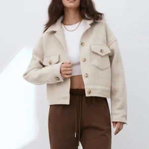 Cropped button-front jacket by Commense. Boxy fit with flap chest pockets. Soft textured fabric for warmth. Classic collar and long sleeves. Neutral tone for easy layering.