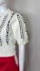 Charming knit sweater featuring a cream base with striking black embroidery. The top boasts a sophisticated round neck and unique embroidery detailing that cascades down the front and sleeves. The short sleeves add to its appeal, making it a versatile piece for layering or wearing on its own. This sweater can easily be dressed up with tailored trousers for a polished office look or paired with jeans for a casual weekend brunch.