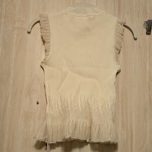 Chic sleeveless blouse with ribbed texture. Features fringe detailing at the hem. Ideal for a stylish look.