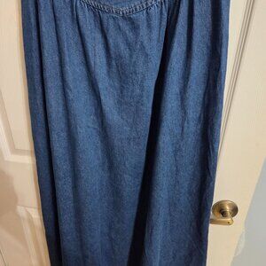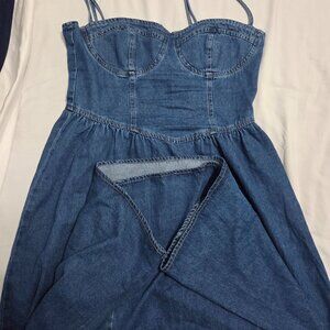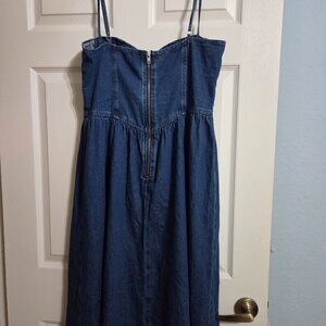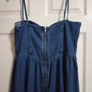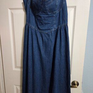 Commense dress, denim blue, size Large, adjustable spaghetti straps, zippers in back, maxi length, unlined, 80% cotton, 8% Viscose, 12" polyester, hand wash, measures 18" armpit to armpit, 16" across the waist, 44-1/2" top to bottom.