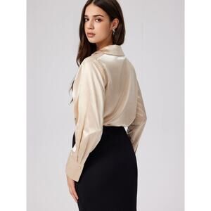 Commense Elegant Satin Old Money Pleated Long Sleeve Blouse Champagne Small