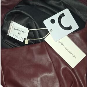 Sleek and modern, this Commense faux leather midi skirt is the perfect blend of edgy and elegant. Designed in a deep burgundy that reads more brown in person, this skirt features a flattering high waist, subtle side ruching, and a daring thigh-high slit for a confident silhouette.