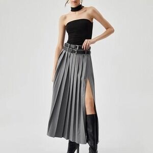 Commense Grey Pleated Split Maxi Skirt Without Belt Medium
