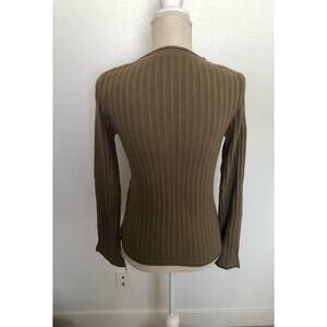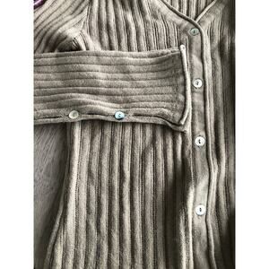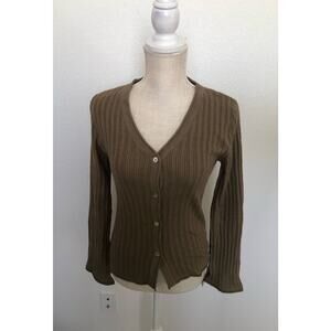 This cardigan is a perfect basic. It is a latte brown long sleeve lightweight ribbed cardigan. Perfect for layering. The front and cuff area feature buttons that look like mother of pearl. The sleeves have a very slight flare at the cuff and the buttons on the cuffs give it an added detail, The material has a slight stretch. New with tags.