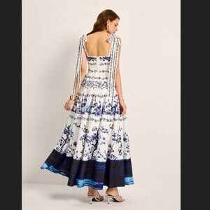 Commense Medium Blue White Floral Tie Strap Tiered Maxi Dress Summer Coastal