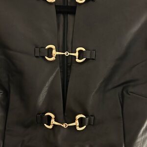 Chic black mini dress with striking gold buckle details. Perfect for a night out. Brand new