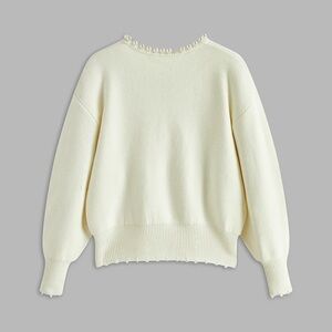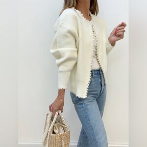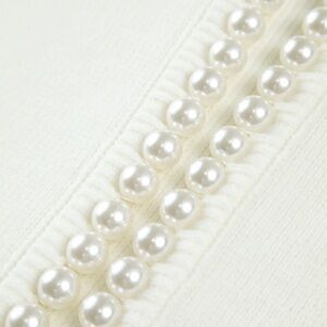 This elegant white sweater features a chic pearl trim, perfect for adding a touch of sophistication to any outfit. Ideal for both casual and formal occasions.