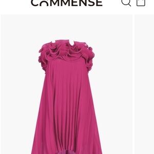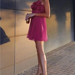 Vibrant fuchsia pink mini dress. Features elegant ruffles. Pleated design adds texture.