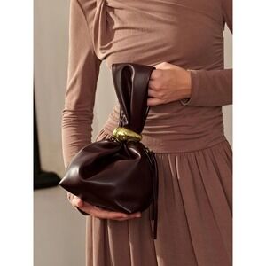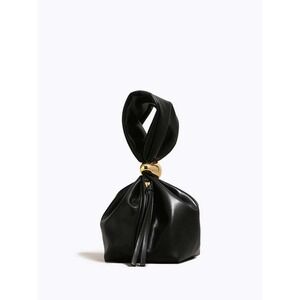 Statement piece alert! This black pouch clutch bag is the epitome of modern elegance. The unique gathered design creates a soft, sculptural form, while the striking gold ring handle adds a touch of glamour and makes it easy to carry.