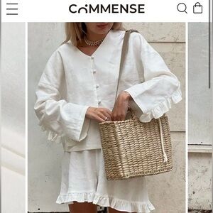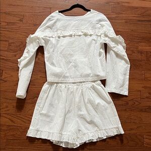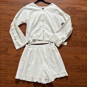 Chic white ruffle skirt and blouse set. Perfect for a stylish look.