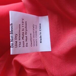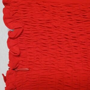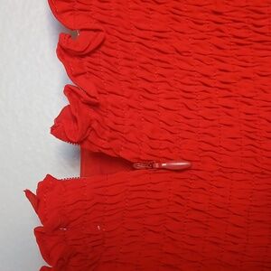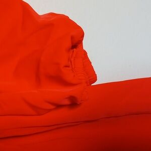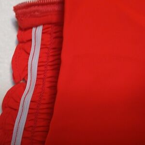 new with tags, bright red, elastic and zipper on back, open on one front of leg, long sleeve