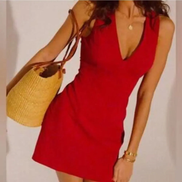 Elegant red mini dress. Sleeveless with a deep V-neck. Perfect for any occasion.