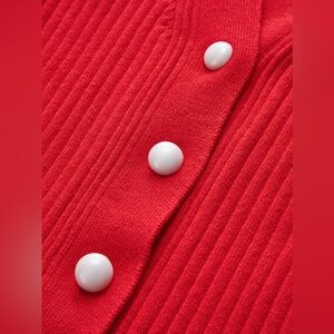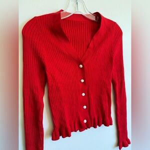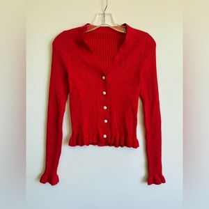 Vibrant red ribbed cardigan. Button-up front. Long sleeves. Stylish and versatile.
