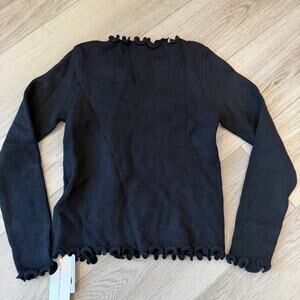 Add a touch of sparkle to your wardrobe with this adorable black stretch sweater! Featuring a delicate rhinestone bow detail and a charming lettuce trim, this sweater is perfect for adding a chic, girly flair to any outfit. The comfortable stretch fabric ensures a flattering fit, making it ideal for both casual and dressier occasions.