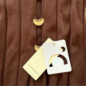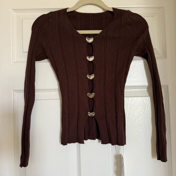 Brown ribbed long sleeve top. Silver buttons cannot be opened. Open design down center between buttons