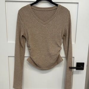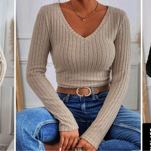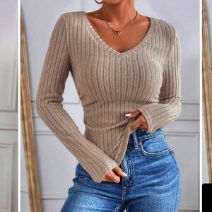 Stylish ribbed V-neck sweater in a neutral tone. Perfect for casual outings.
